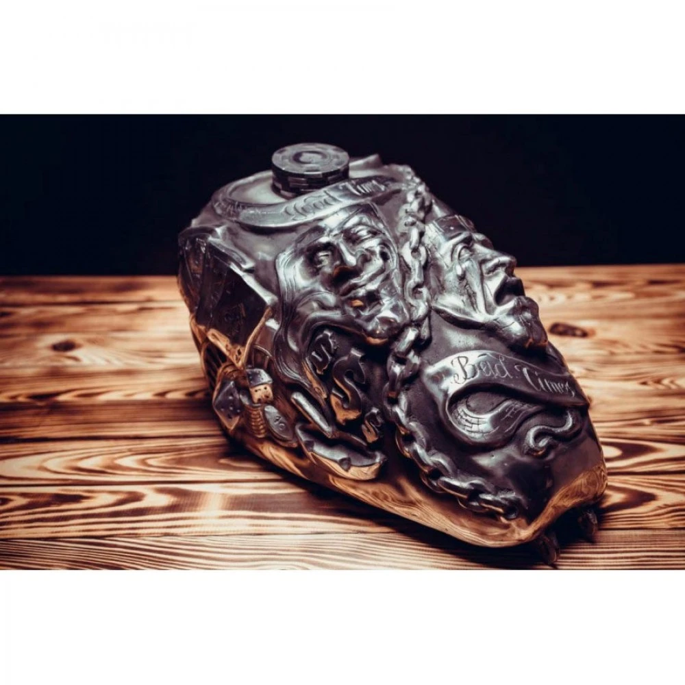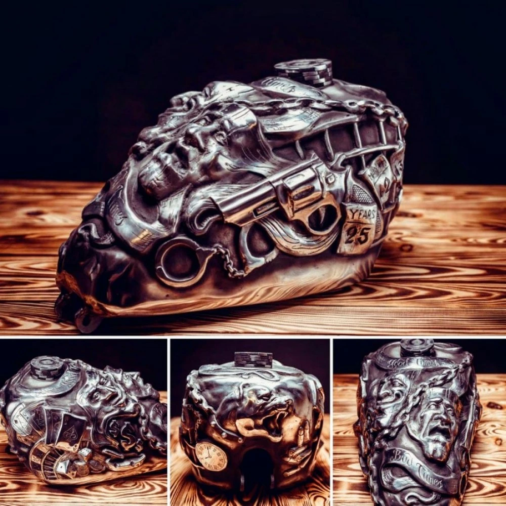 Als Negativform diente ein Sportster Tank (vor 2003 Modell). Dieser Tank kann auf den Großteil der Chopper Motorräder montiert werden sowohl zum fahren als auch für Show-Zwecke.
